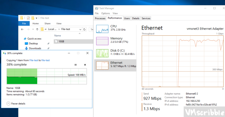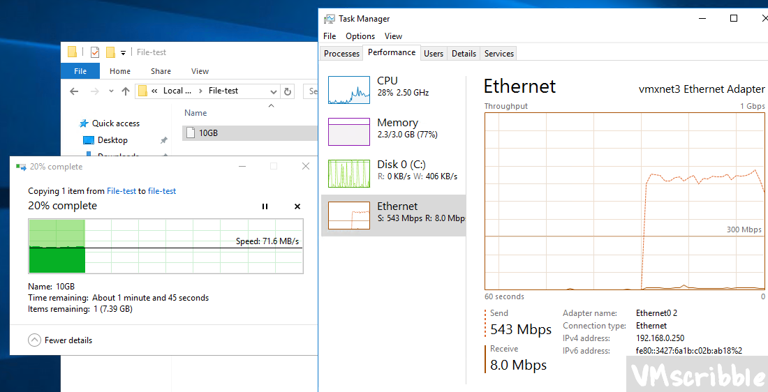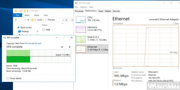 Via powershell, created a 10GB file on VM 1 on host 1 to send to a share on VM2 on host 2.
