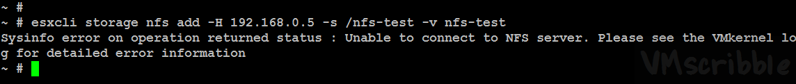 2016-04-11T22:58:22.699Z cpu1:33971 opID=9417ea08)NFS: 168: NFS mount 192.168.0.5:/nfs-test failed: Unable to connect to NFS server.