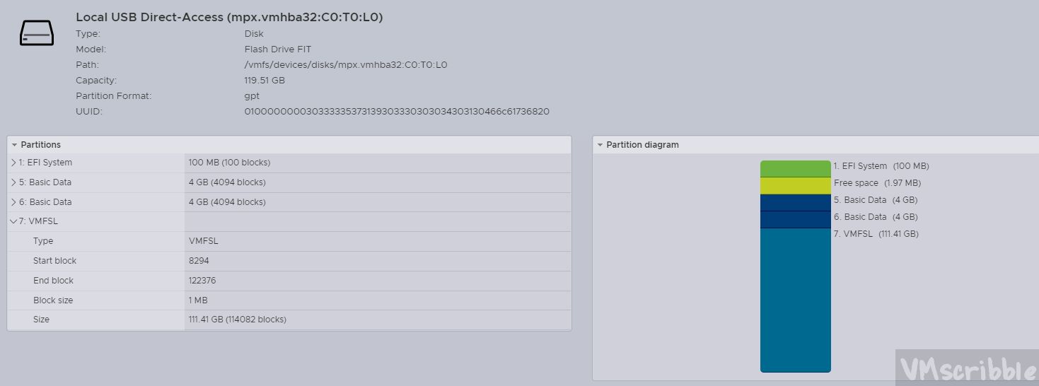 on a 128 GB – SAMSUNG FIT Plus 3.1 USB Flash Drive – MUF-128AB/AM - Installed ESXi 8.0 to the 128GB USB drive (accepted the warnings during the install about using a USB drive and did not pick an existing NVMe/SATA drive).