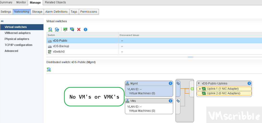 The management and vmotion VMkernel adapters are connected to their own separate Distributed switch (vDS). No standard vswitches (vSS)