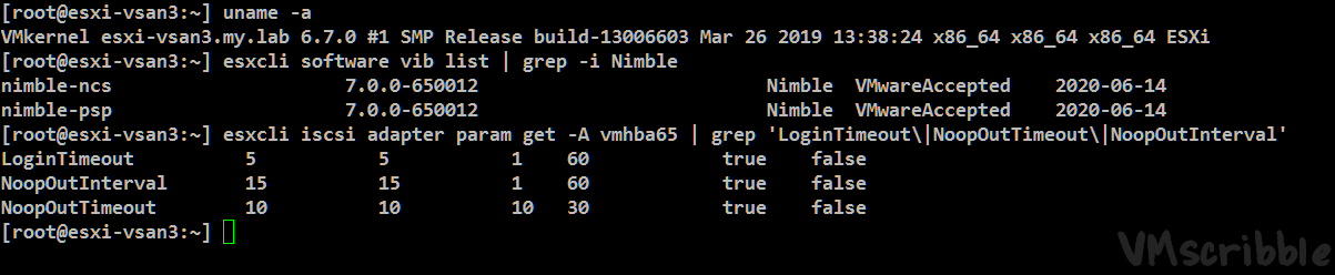 Validate via a putty session to the ESXi host. (change vmhba65 to your correct #) 1st # is the current. esxcli iscsi adapter param get -A vmhba65 | grep 'LoginTimeout\|NoopOutTimeout\|NoopOutInterval'