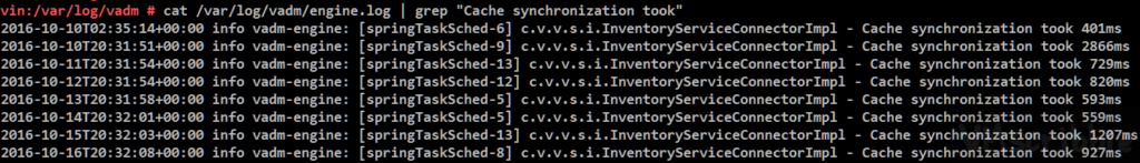 cat /var/log/vadm/engine.log | grep “Cache synchronization took”
