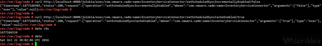 curl http://localhost:8080/jolokia/exec/com.vmware.vadm:name=InventoryServiceConnector/setScheduledSyncIncrementallyEnabled/false