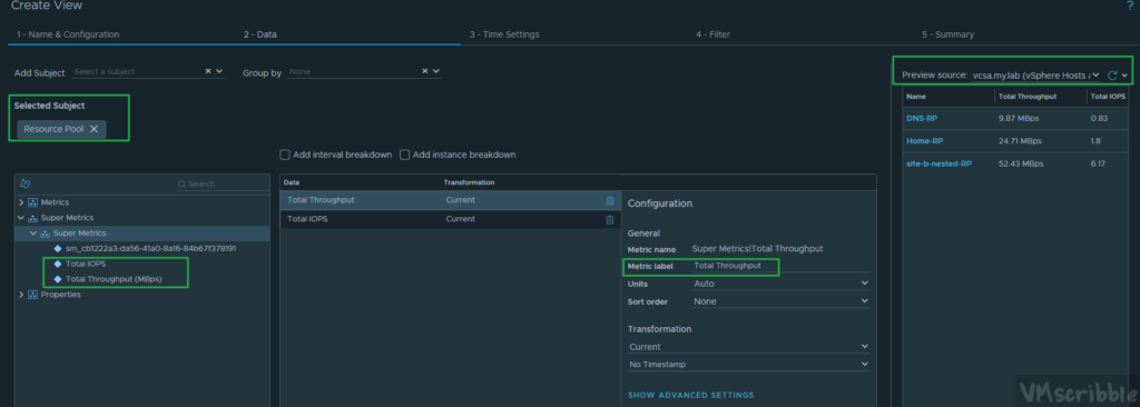 When you pick the vCenter, the View is filled in with the metrics in scope.